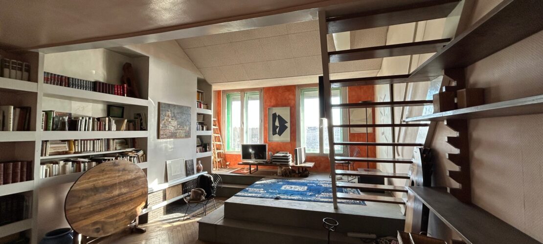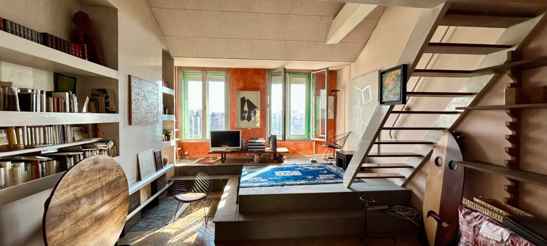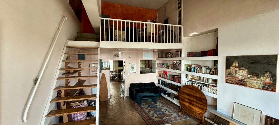 Un appartement au dernier étage (avec ascenseur) comprenant un grand séjour avec vue sur la Place et les quais, une cuisine côté cour et une chambre desservie par un escalier intérieur.