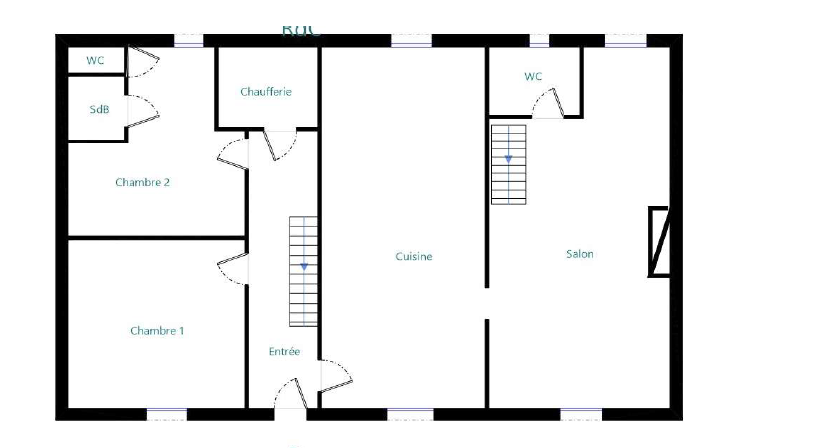 Au rez-de-chaussée : Salon avec point d’eau et sanitaire, cuisine, chaufferie, deux chambres dont une avec salle de bain et WC.